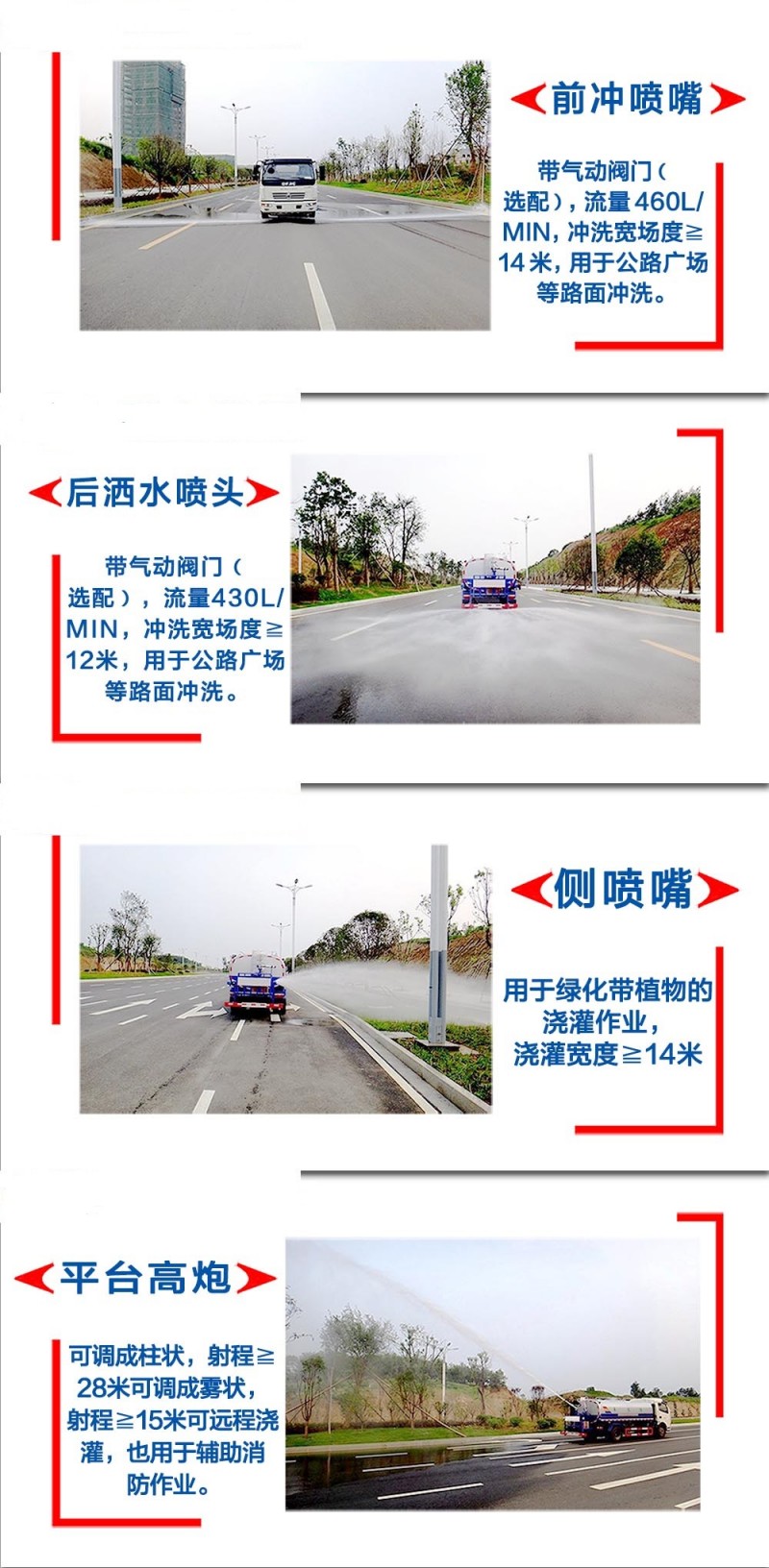 功能介紹:前沖(噴)后灑、帶側噴、后置工作平臺、平臺上安裝綠化灑水高壓炮(炮噴射形狀可調:直沖狀、大雨、中雨、毛毛雨,可連續調節,最大射程可達28米) ,配備全國質量領先的“程力威”牌大功率專用灑水泵,帶消防接頭,帶自流閥,帶自吸功能,帶濾網。
