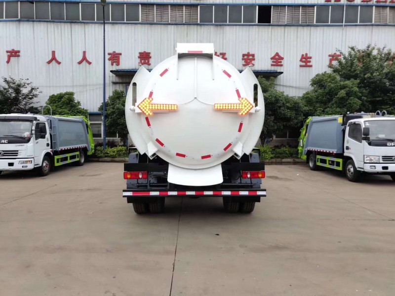 圓形碳鋼罐體,罐體厚度5mm,拉桿提升機帶上蓋聯動;后蓋液壓開啟;罐體舉升自卸。選裝內軒推鏟卸料,帶渣液分離功能。餐廚垃圾車可分罐式和廂式。