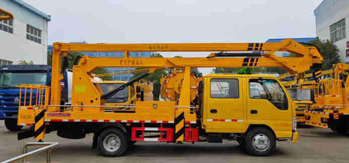 慶鈴五十鈴18米高空作業車采用折疊式曲臂結構,作業臂為三節折疊式,工作斗和轉臺雙工作位,上下操作,電液控制,可360度回轉,四液壓支腿,工作斗內可控制發動機啟停,大臂帶卷揚吊鉤系統,安全吊重900kg,載人工作斗承重200公斤,鋼制工具箱和花紋防滑走臺板,不銹鋼圍欄。